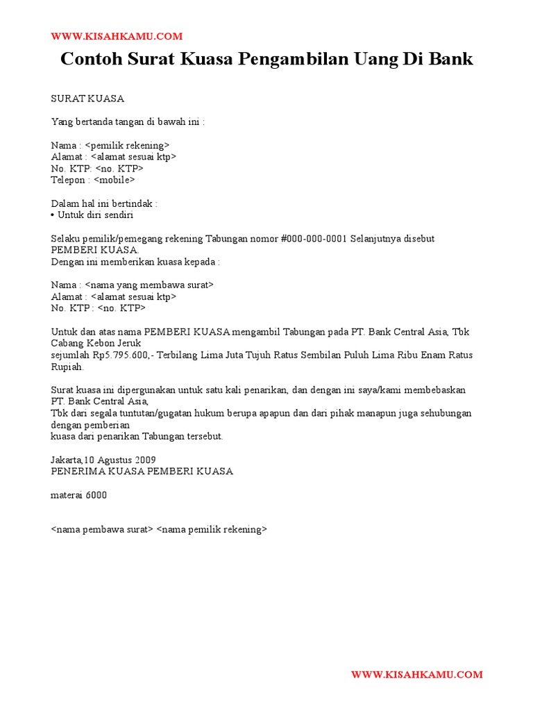 Biasanya contoh surat kuasa dibuat dengan tujuan perwakilan pengambilan uang gaji, pengambilan ijazah, pengambilan. Lantas bagaimana cara membuat surat kuasa pengambilan uang di bank mandiri itu? Jakarta,10 agustus 2009 penerima kuasa pemberi kuasa materai 6000 <nama pembawa surat> <nama pemilik rekening> www.kisahkamu.com www.kisahkamu.com contoh surat kuasa pengambilan uang di bank ke 2 surat kuasa yang bertanda tangan dibawah ini : Contoh surat kuasa pengambilan uang di bank. Terkadang tidak semua keperluan akan suatu hal bisa diambil dengan mudah tanpa pemilik asli.